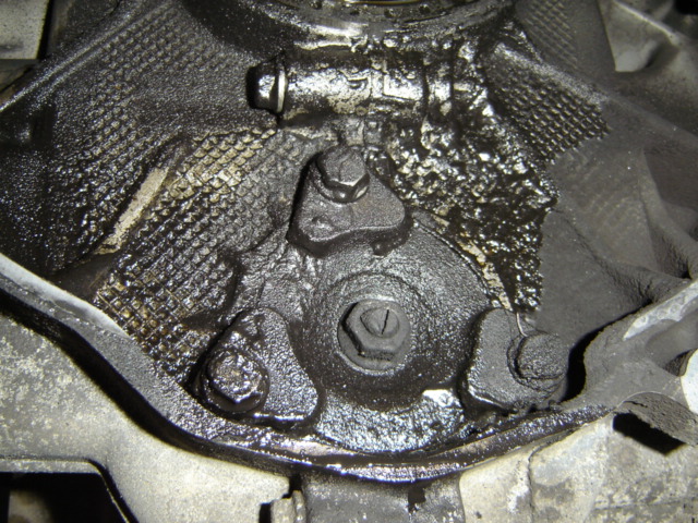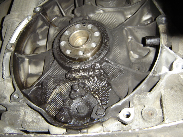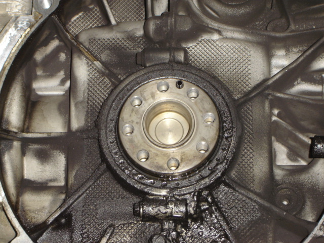 As we look below the main seal and the crank you can see the degree of oil that had leaked from the seal over one of the transmission case bolts and eventually over the balance shaft cover. Just look at the sludge build up! |