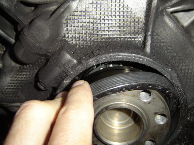 So there it is, the rms removed from around the crank. Since I had just recently changed the oil in the car I was expecting a gush of oil to come out once the seal was removed but to my surprise it was dry. Make sure no debris gets into the exposed RMS area! |