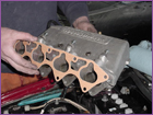 Put the new intake gasket onto the head and lower the JRSC manifold into place. The manual says to install the charger after the manifold is in place, however we decided it was easier to lay the charger down first and then install the manifold. |